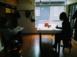 今回は、フルーツのデッサン。りんご、ばなな、オレンジを容易。あとはちょっと高さを出そうかと花瓶や瓶をおいたり。
